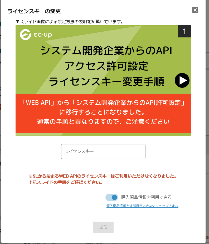(2)ライセンスキー変更画面の右下の「購入商品情報を利用できる」のスイッチボタンをONにして再度ライセンスキーの送信。