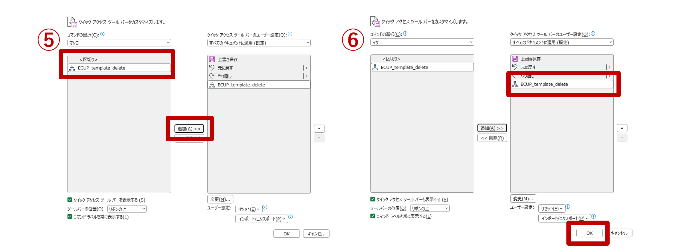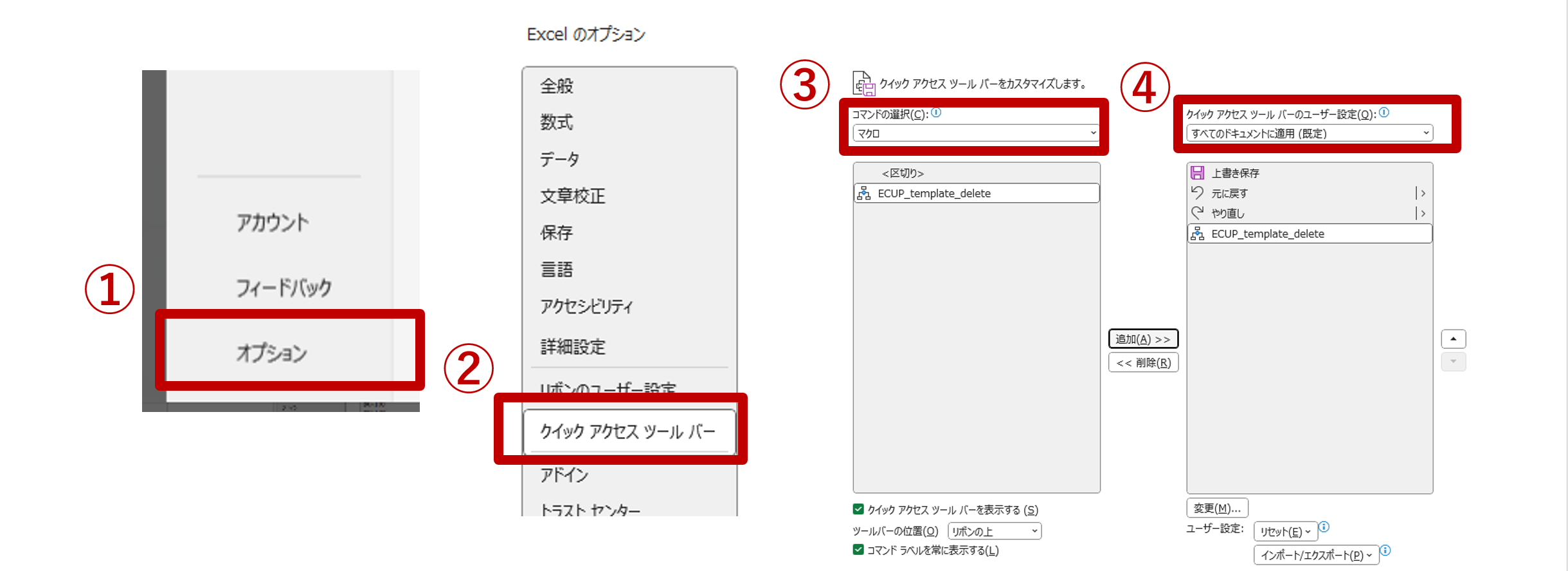 この作業でECUP_templeate_deleteというマクロをクイックアクセスツールバーに登録します。